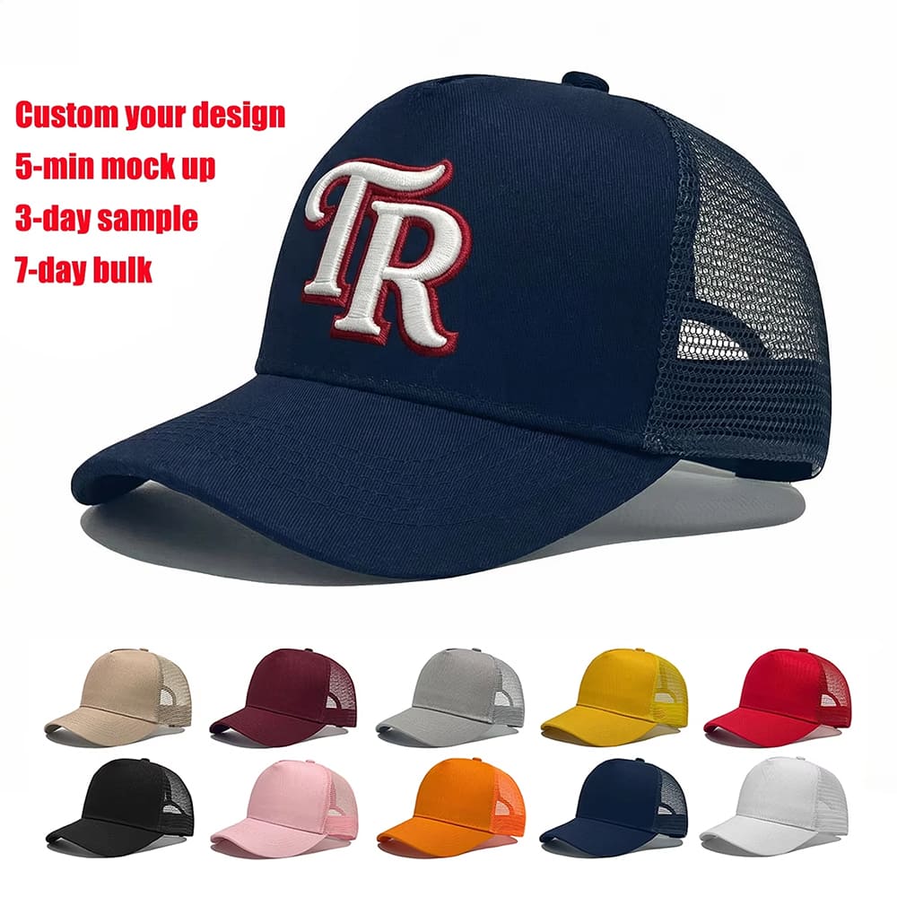 Logo position: front panel, brim/visor, Left panel, back curved part, Right Panel